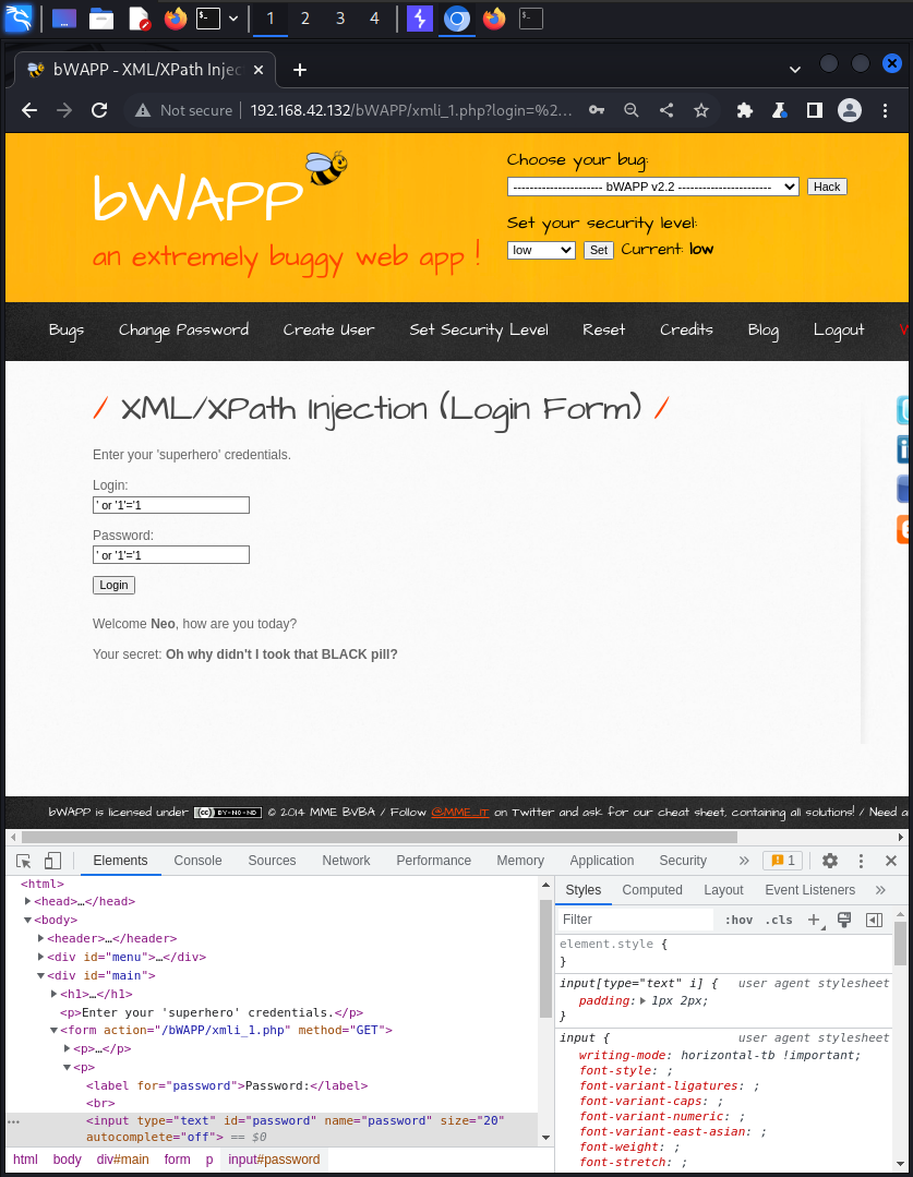 bWAPPA1 - InjectionXML/XPath Injection (Login Form)XML/XPath Injection (Login Form) (low) Payload в поле логина и пароля