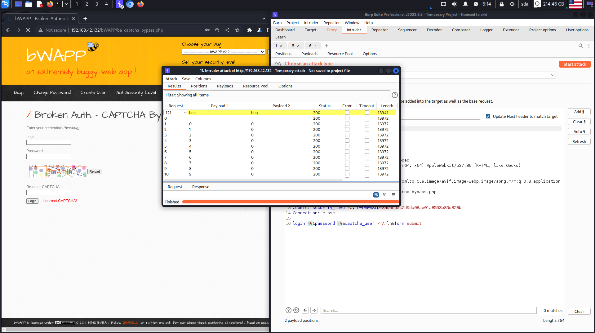 bWAPPA2 - Broken Auth&Session MgmtBroken Auth - CAPTCHA BypassingBroken Auth. - CAPTCHA Bypassing Брутим пароль и логин, но главное заполнить капчу