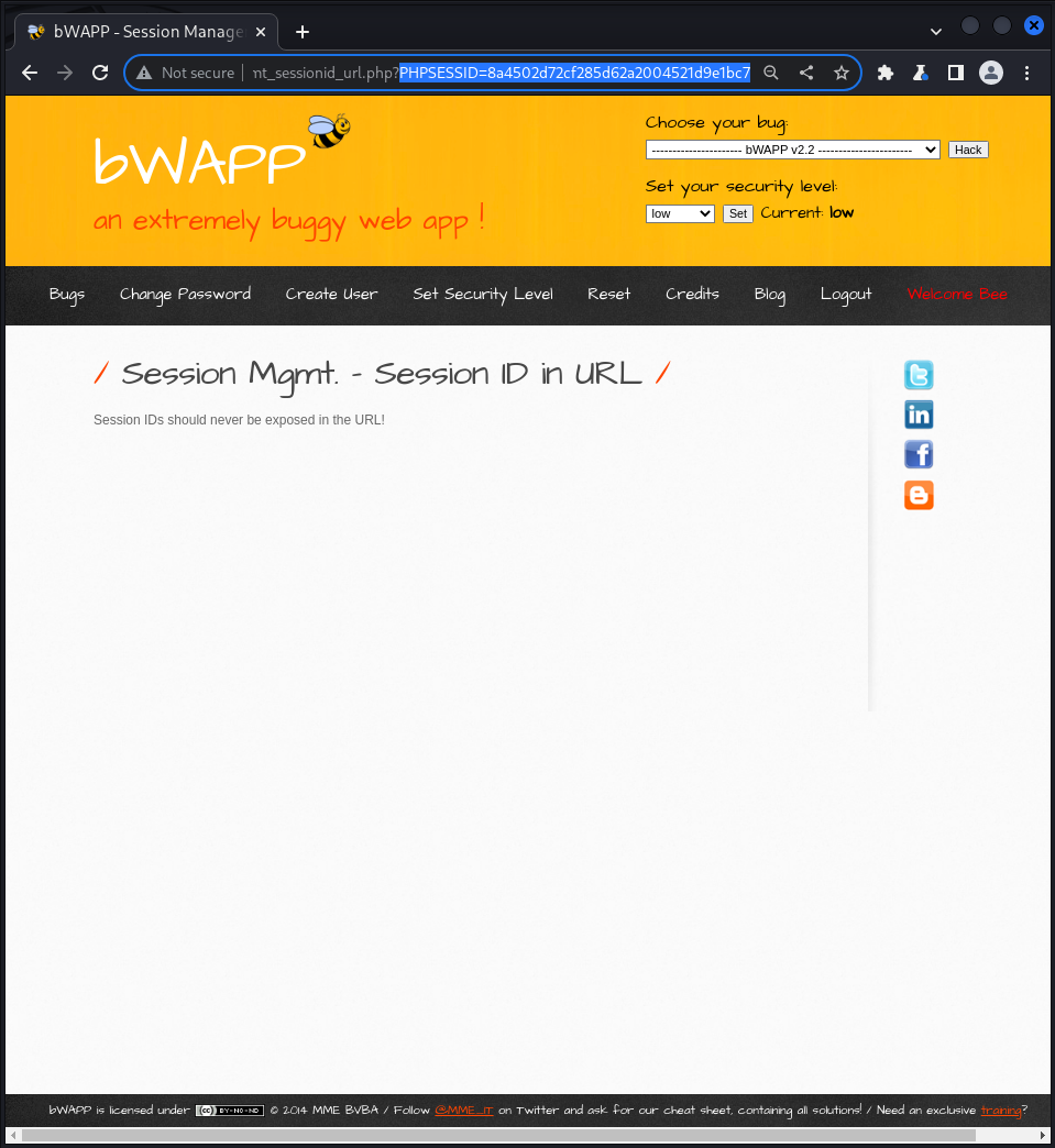 bWAPPA2 - Broken Auth&Session MgmtSession Management - Session ID in URLSession Management - Session ID in URL Такое же выполнение через подмену PHPSESSID, но в этот раз мы можем взять его из URl