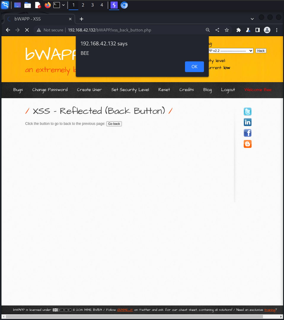 bWAPPA3 - Cross-Site Scripting XSSCross-Site Scripting - Reflected (Back Button)Cross-Site Scripting - Reflected (Back Button) Используем payload и вставляем его вместо пересылки на страницу назад ';alert('**BEE**');'