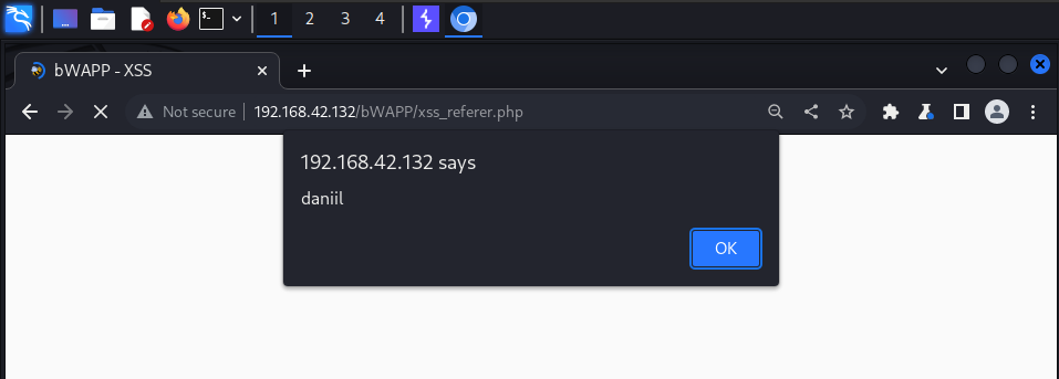 bWAPPA3 - Cross-Site Scripting XSSCross-Site Scripting - Reflected (Referer)Cross-Site Scripting - Reflected (Referer) В поле Referer вставляем payload <script>alert("daniil")</script>