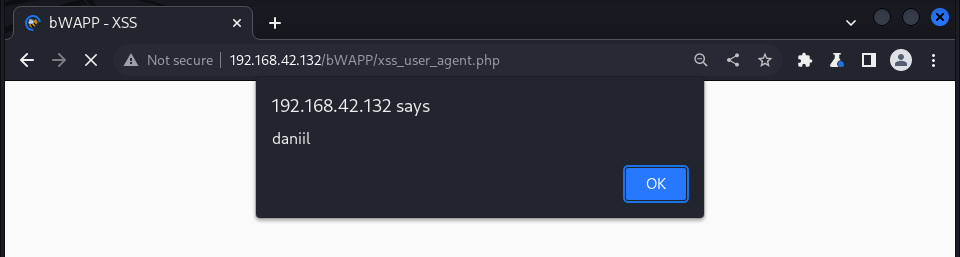bWAPPA3 - Cross-Site Scripting XSSCross-Site Scripting - Reflected (User-Agent)Cross-Site Scripting - Reflected (User-Agent) В поле User-Agent вставляем payload <script>alert("daniil")</script>