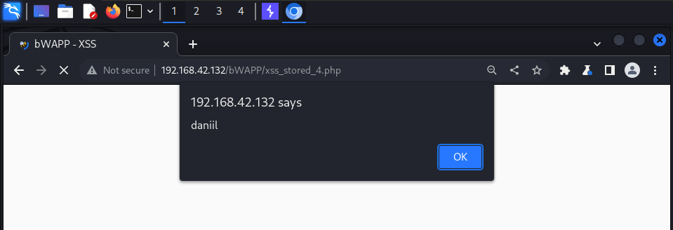 bWAPPA3 - Cross-Site Scripting XSSCross-Site Scripting - Stored (User-Agent)Cross-Site Scripting - Stored (User-Agent) В поле User-Agent вставляем payload <script>alert("daniil")</script>