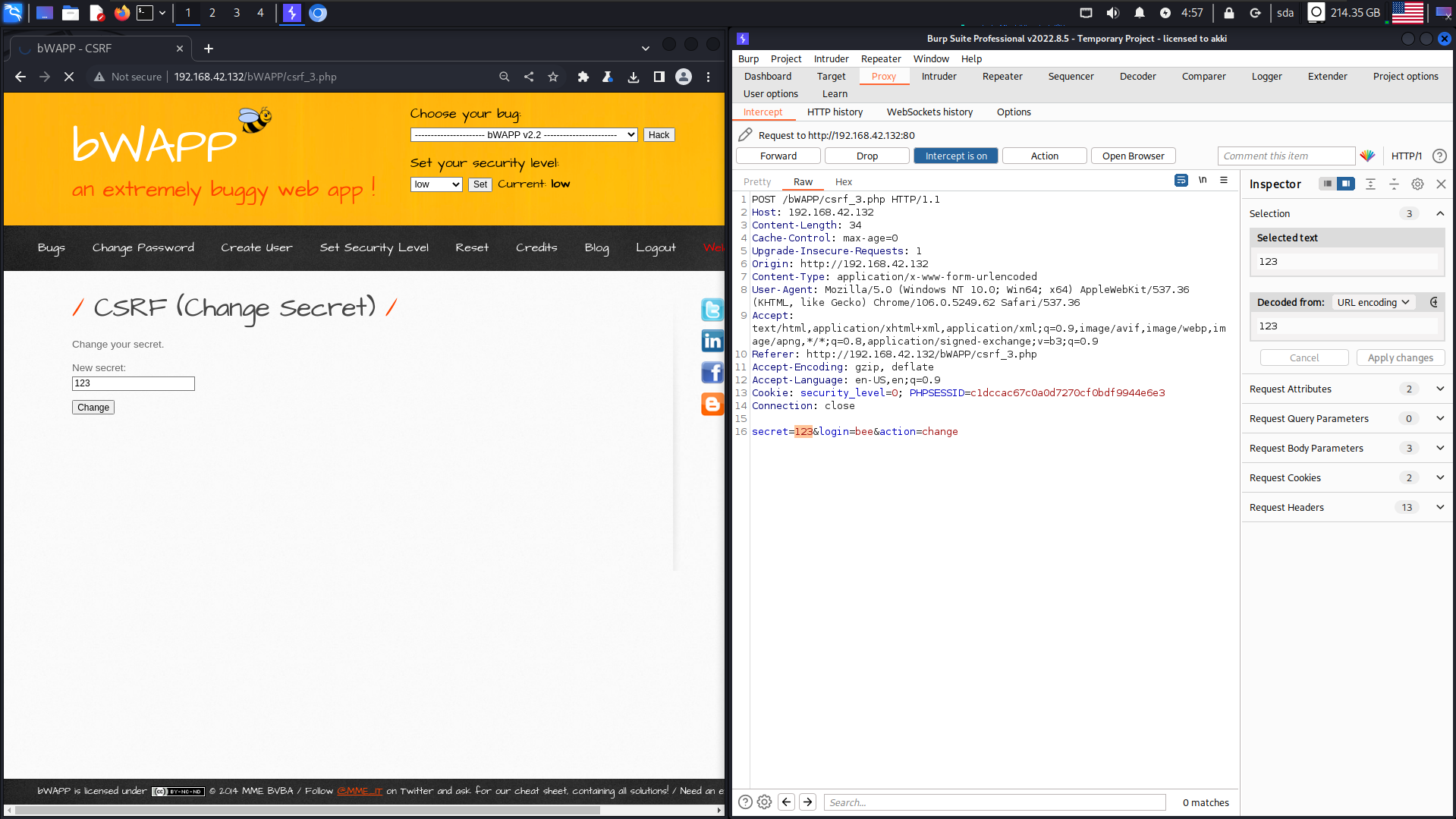 bWAPPA8 - Cross-Site Request Forgery CSRFCross-Site Request Forgery (Change Secret)Cross-Site Request Forgery (Change Secret) Аналогично прошлому заданию